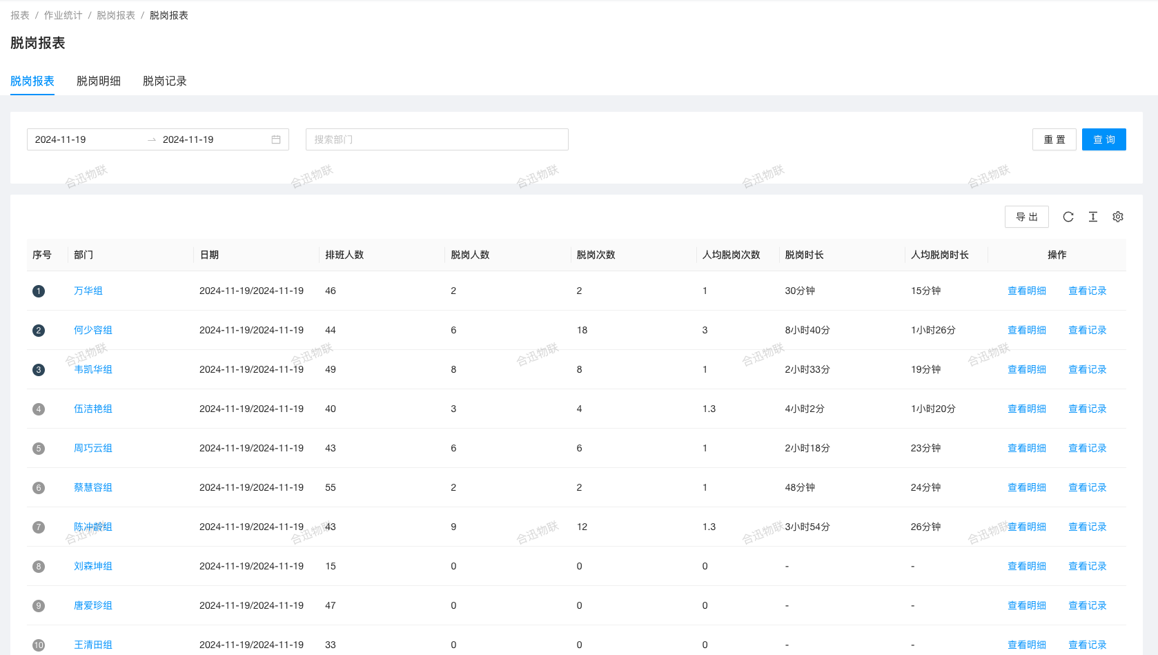 作业数据涵盖出勤、坐岗、脱岗、空气员工及工位报表,全面呈现员工作业状态,精准识别问题岗位与人员,助力优化劳动力配置与提升作业效率。